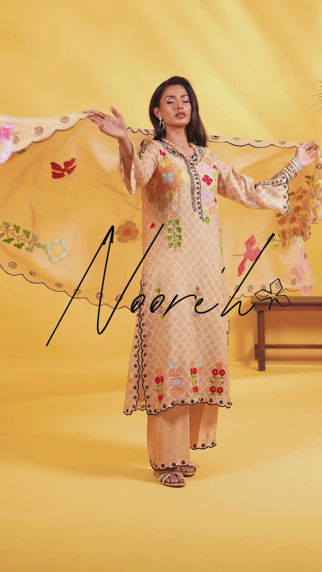 Description: This graceful 3pc ensemble is crafted on a softly textured base and adorned with vibrant, intricate embroidery throughout. The long shirt features a beautifully detailed neckline accented with contrasting black threadwork and scalloped embellishment, while the front is scattered with colorful embroidered motifs in floral and symbolic shapes, adding a lively yet balanced charm. Paired with matching trousers and a fully embroidered khaddi net dupatta with floral vines and scalloped edges, it is perfect for festive daytime wear.